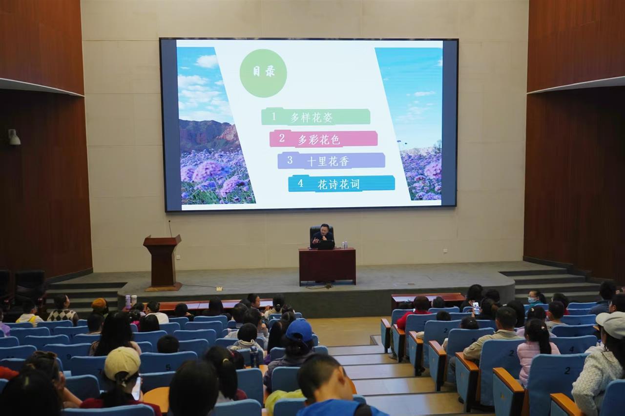 讲座伊始,覃瑞教授以校园里常见的樱花、紫荆花为例,用生动形象的语言开启了“多样花姿”的探秘之旅。他借助高清图片展示了喇叭形的牵牛花、蝶形的紫藤花、杯状的郁金香等不同形态的花朵,细致讲解了花姿与传粉方式之间的奇妙关联。当讲到“有些花朵的形状是为了精准适配特定昆虫”时,小读者们纷纷前倾身体,眼中满是惊奇。