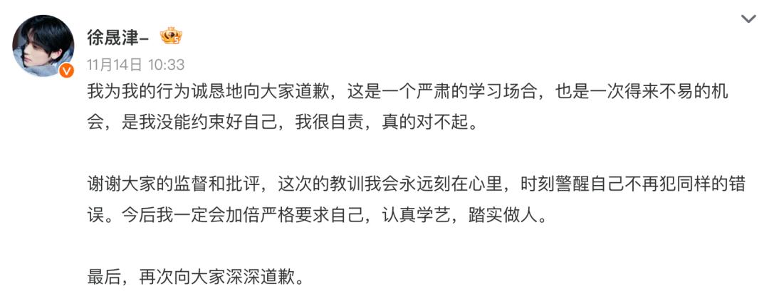 11月14日,徐晟津发文道歉: