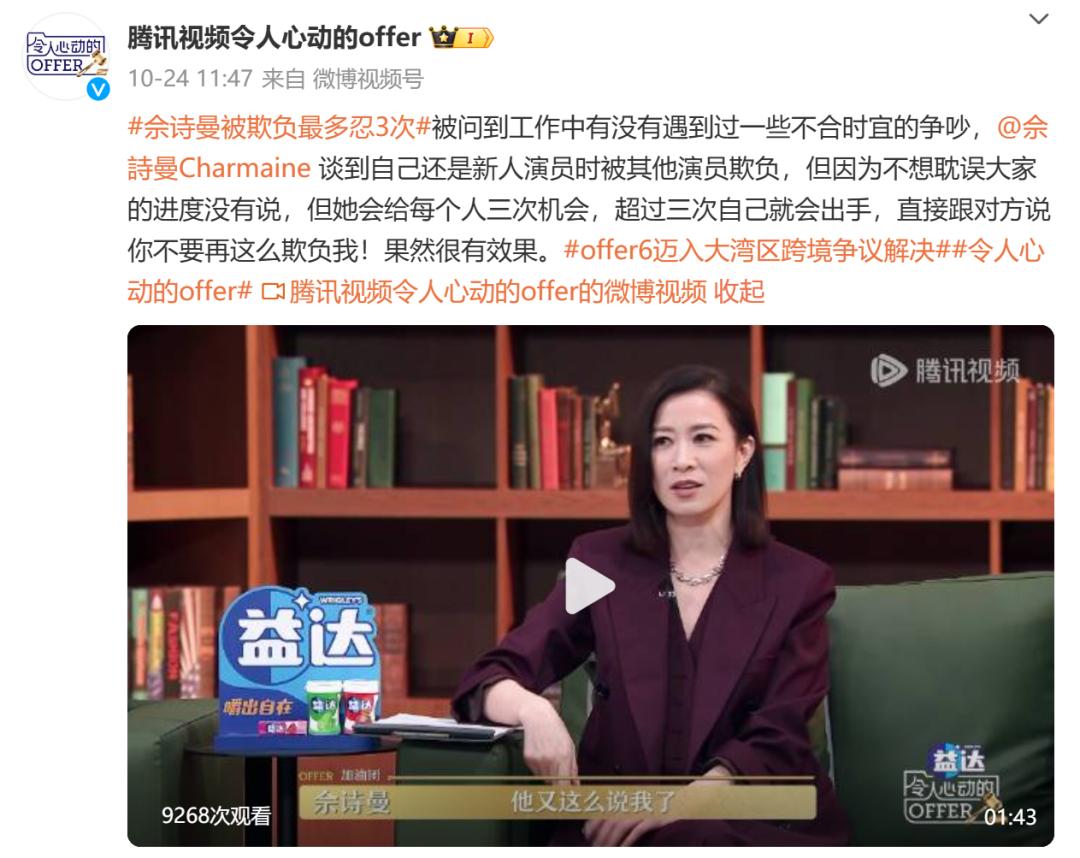 节目中当提到工作中有没有遇到过一些不合时宜的争吵时,佘诗曼分享了自己做新人时的经历。佘诗曼表示,(同剧男演员)他会对你指指点点、说你走错位、挡住光这些,而且还是当着所有人的面说,有种给新人下马威的感觉。面对这种情况,佘诗曼随后表示“因为我是一个很冷静的人,我不想影响到大家的进度、情绪,所以什么都不想,但是我会给每个人三次机会,如果你再来的话,我就出手了。”